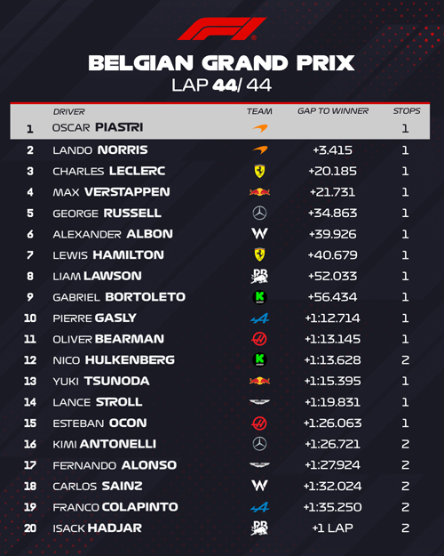 O australiano Oscar Piastri (McLaren) fez uma manobra de campeão sobre o companheiro de equipe Lando Norris logo que a prova foi iniciada, após adiamento de 1h20 por conta das condições do asfalto, muito molhado, para vencer o GP da Bélgica, 13ª etapa do Mundial de Fórmula 1, prova disputada neste domingo (27) no tradicional circuito de Spa-Francorchamps.